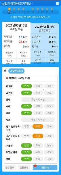 또, 농장 날씨의 최고기온, 최저기온, 강수량 등 10종의 정보를 제공하며, 이중 기온은 최대 9일까지 예보한다. 농장 재해는 고온해, 저온해, 동해 등 15종의 정보를 제공하며 작물의 생육단계에 맞춰 재해위험 여부 및 대응조치를 최대 9일 전에 알려준다.
