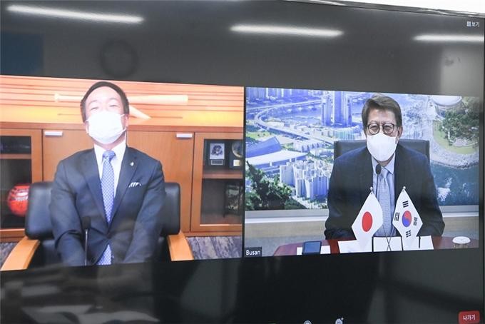 [부산=최성일 기자] 부산시(시장 박형준)는 지난 1일 오전 박형준 부산시장이 마에다 신타로 시모노세키시장과 자매결연 45주년 기념 화상회의를 개최했다고 밝혔다.