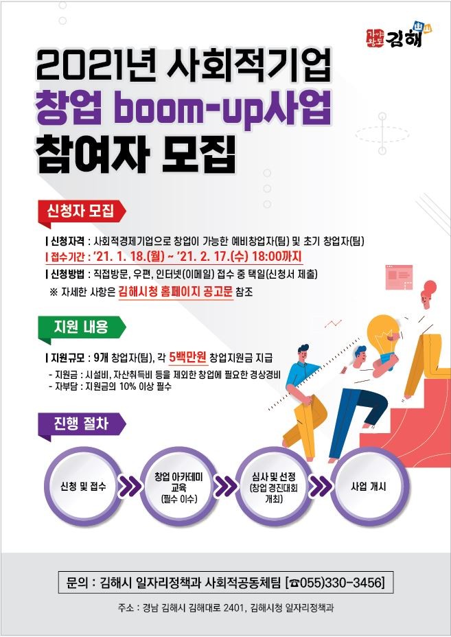 김해시는 오는 1월 18일부터 2월 17일까지 “2021년 사회적기업 창업 BOOM-UP(붐업) 사업” 참여자를 모집한다고 밝혔다.