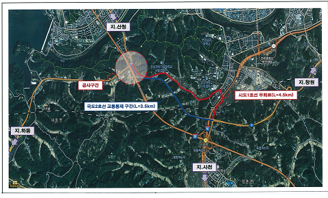 이 구간을 통행하려는 차량은 내동교차로~가좌삼거리~화개교차로(L=4.5km)를 경유하는 시도1호선으로 우회(L=4.5km)하면 된다.
