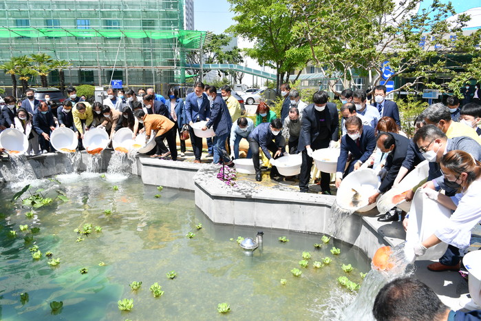 양산시가 지난 11일 시청사 정원에 조성된 연못쉼터에 양산시와 양산시의회, 그리고 13개 읍면동을 상징하는 물고기를 함께 방류하는 입어식을 열며 소통의 의미를 되새겼다.