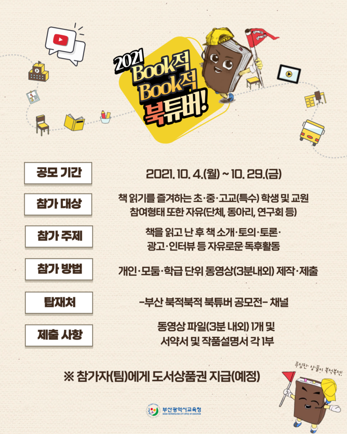 부산광역시교육청(교육감 김석준)은 10월 4일부터 29일까지 부산지역 초·중·고 학생과 교사들을 대상으로 유튜브 채널을 활용해 ‘2021 Book적Book적 북튜버!’ 한마당 행사를 연다.