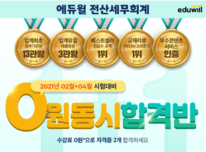 [시민일보 = 여영준 기자] 종합교육기업 에듀윌(대표 박명규) 전산세무회계 '0원 동시합격반'은 전산회계 1, 2급과 전산세무 1, 2급 자격증 중 2개의 자격증에 합격하면 수강료를 되돌려 주는 강의다.