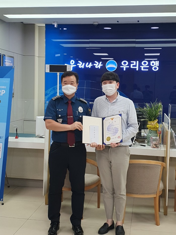 양산경찰서는(서장 정성학) 지난 27일 우리은행 양산금융센터에 방문하여 전화 금융사기(보이스피싱) 피해를 예방한 은행직원에게 감사장 수여를 하였다. 이 자리에는 그룹장(전병조), 지점장(이광훈), 유공 직원 김선훈 등이 참석하였다.