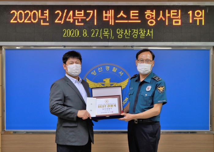 양산경찰서(서장 이병진)에서는, 지난 27일 경남지방경찰청 2부장(경무관 김흥진)이 방문하여 ’20년 2분기 베스트 형사팀·지역관서(양주파출소) 인증패 제막식 행사를 가졌다.
