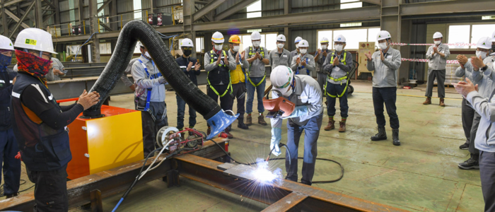 현대인프라솔루션은 13일 윤성일 대표이사 등 회사 관계자가 함께한 가운데 안전기원제와 생산 착수를 의미하는 아크용접 시연회를 개최하고 대불 공장의 본격적인 가동을 알렸다.