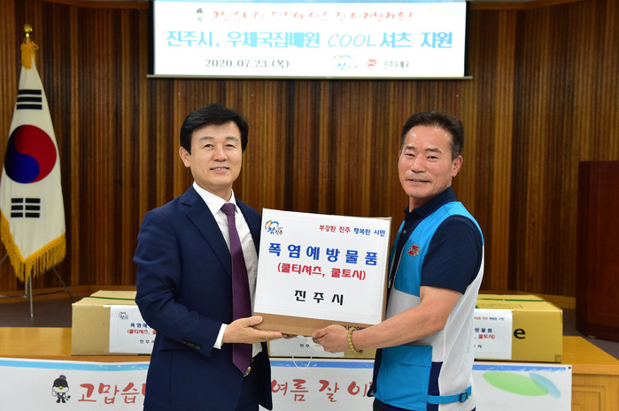 진주시는 예년보다 무덥고 폭염일수가 증가할 것으로 전망됨에 따라 지난 23일 진주우체국 현장근로자 150명에게 쿨티셔츠, 쿨토시 등 폭염예방물품을 지급하여 더운 여름 현장에서 땀 흘리며 근무하는 집배원들이 폭염 속에서 건강하고 안전한 여름을 보내도록 도왔다.