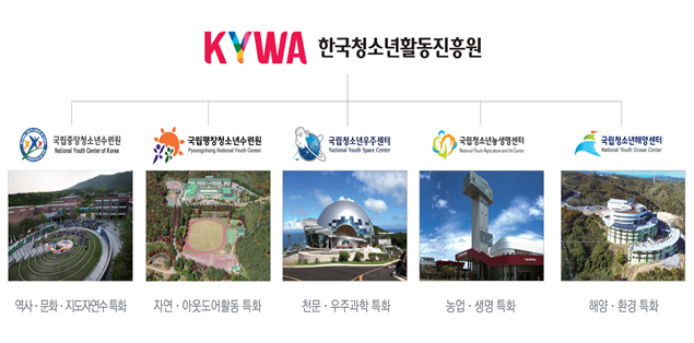 한편, 국립청소년시설은 청소년의 균형 있는 성장을 위해 전국 5개 지역(천안, 평창, 고흥, 김제, 영덕)에 위치하여 각 시설별 테마(역사・문화, 야외・모험, 우주, 농생명, 해양)를 기반으로 다양한 형태의 청소년 활동을 지원하며, 국가가 인증한 청소년수련활동인증제 프로그램으로 안전한 청소년 활동을 제공하고 있다.