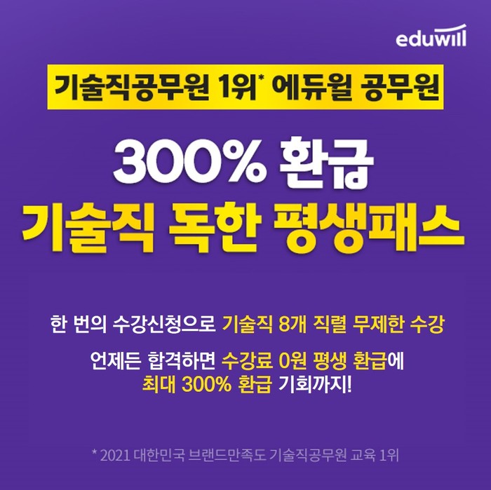 [시민일보 = 여영준 기자] 종합교육기업 에듀윌(대표 박명규)은 2022년 기술직 공무원 시험을 준비하는 수험생들을 위해 ‘300% 환급 기술직 독한 평생패스’를 선보였다고 밝혔다.