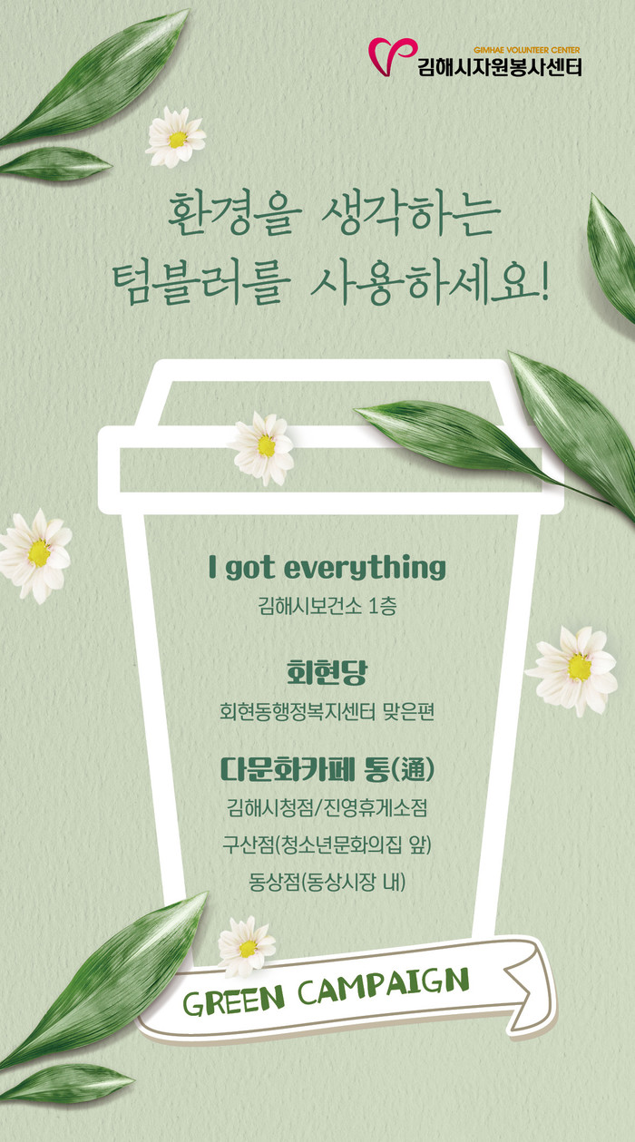 김해시자원봉사센터(센터장 박종주)는 코로나19 여파로 다시 증가한 일회용품 사용 감소에 시민들의 적극적인 동참을 희망하며 「텀블러 쓰고, 콩도장 찍자」환경 캠페인을 오는 24일부터 재추진한다.