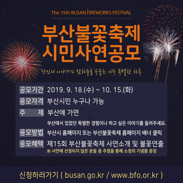 공모 주제는 ‘부산에 가면’으로 부산에서 겪었던 특별한 경험이나 하고 싶은 이야기이며, 부산 시민이면 누구나 9월 18일부터 10월 15일까지 응모할 수 있다. 최종 선정된 5개 사연은 부산불꽃축제 사전행사인 ‘불꽃 토크쇼’에서 신청곡을 배경으로 아름다운 불꽃으로 연출된다.