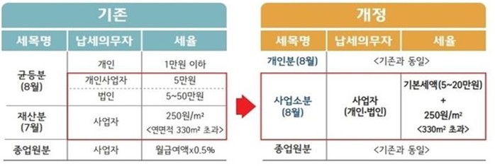 이에 따라 지난해 7월에 주민세 재산분을 신고·납부했던 사업자들은 올 8월에 주민세 사업소분으로 바꿔서 신고·납부해야 하며, 종전 주민세 재산분 외에 주민세 균등분도 함께 신고·납부해야 한다.