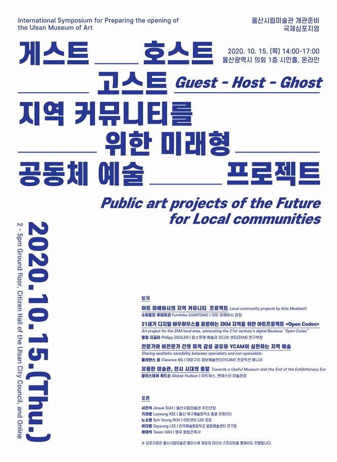 울산시립미술관 추진단(단장 서진석)은 오는 10월 15일(목) 울산시의회 1층 시민홀에서 울산시립미술관 개관 준비 국제심포지엄 ‘게스트 – 호스트 – 고스트 : 커뮤니티를 위한 미래형 미술관’을 개최한다.