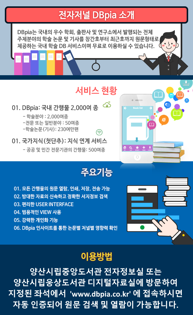 이 전자학술서비스는 양산시립 중앙도서관 전자정보실, 양산시립 웅상도서관 디지털자료실에서 이용하실 수 있으며, 해당 자료실 내 지정된 좌석에서 디비피아(DBPia)에 접속하여 원문을 검색 및 열람할 수 있으며 열람한 자료를 출력하고자 할 경우 각 자료실에서 유료로 출력할 수도 있다.