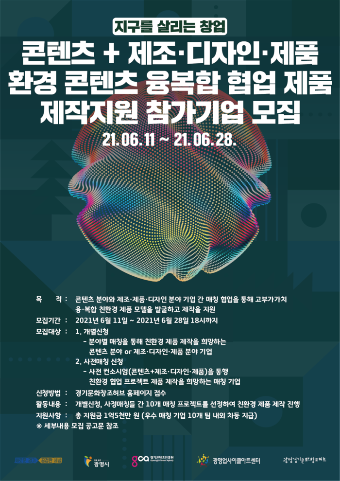 [시민일보 = 이승준] 경기도와 광명시가 운영하는 광명경기문화창조허브(이하 광명허브)에서 환경을 주제로 융‧복합 제품을 제작하는 ‘환경 콘텐츠 융‧복합 협업 제품 제작지원’ 참가기업 모집을 올해 6월 28일까지 진행한다.