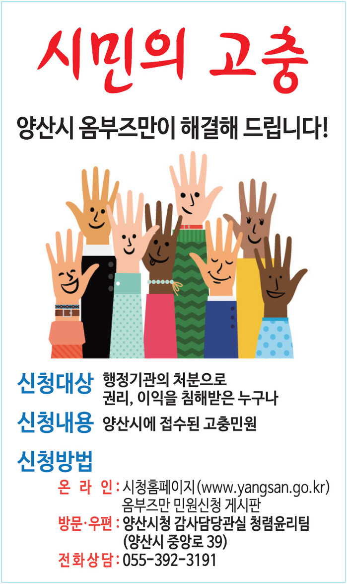 양산시 관계자는 “시민의 권익을 보호하기 위해 만들어진 제도인 만큼 옴부즈만 의 도움이 필요한 시민들의 많은 이용을 바란다”라고 전했다.