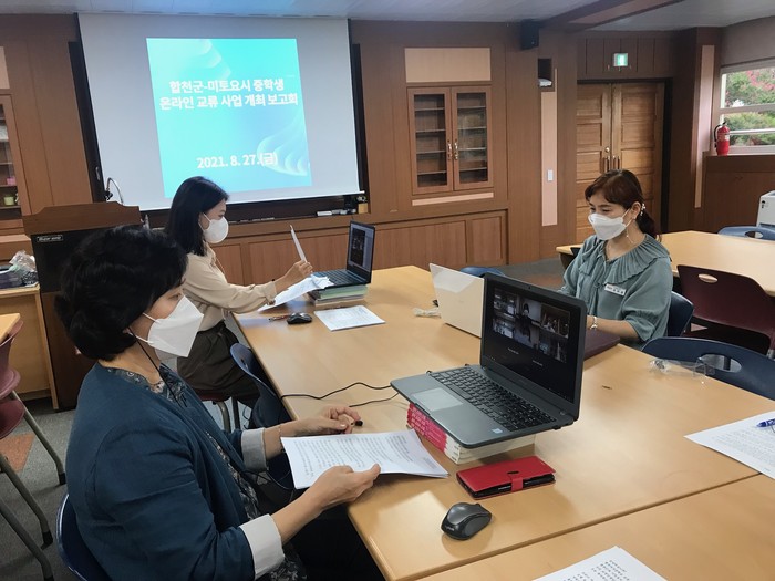 [합천=이영수 기자] 합천군(군수 문준희)은 27일 합천여중 심희정 교장을 비롯한 관계자 8명이 참석한 가운데 ‘합천군-미토요시 중학생 온라인 국제교류 시범사업’ 시행 논의를 위한 온라인 영상회의를 개최했다.