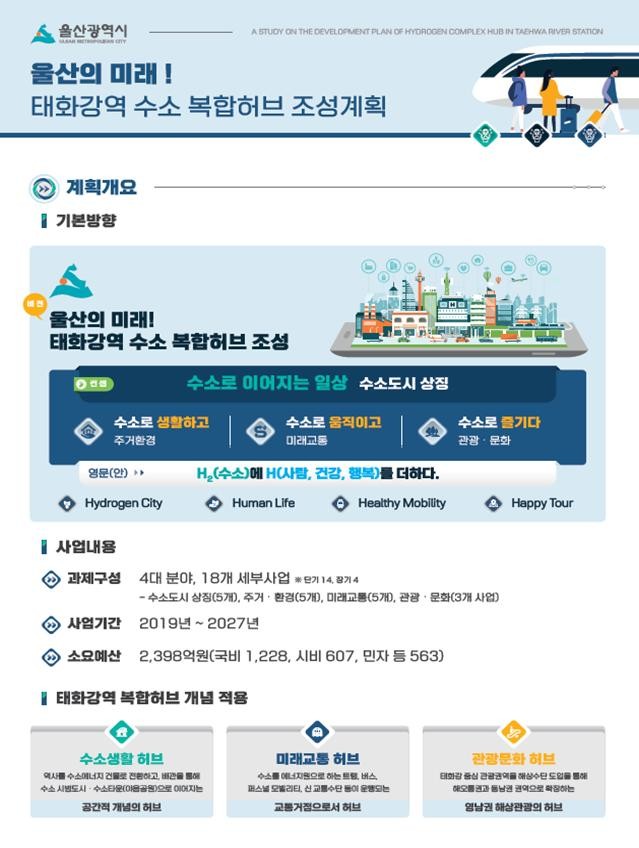 태화강역 수소 복합허브 조성사업은 “수소로 이어지는 일상, 수소로 생활하고, 수소로 움직이고, 수소로 즐기다“라는 주제와 ”H2(수소)에 H(사람,건강, 행복)를 더하다“의 부제를 실현할 ▲수소도시 상징 ▲주거·환경 ▲미래교통 ▲관광·문화 4대 분야 18개 세부사업으로 구성된다.