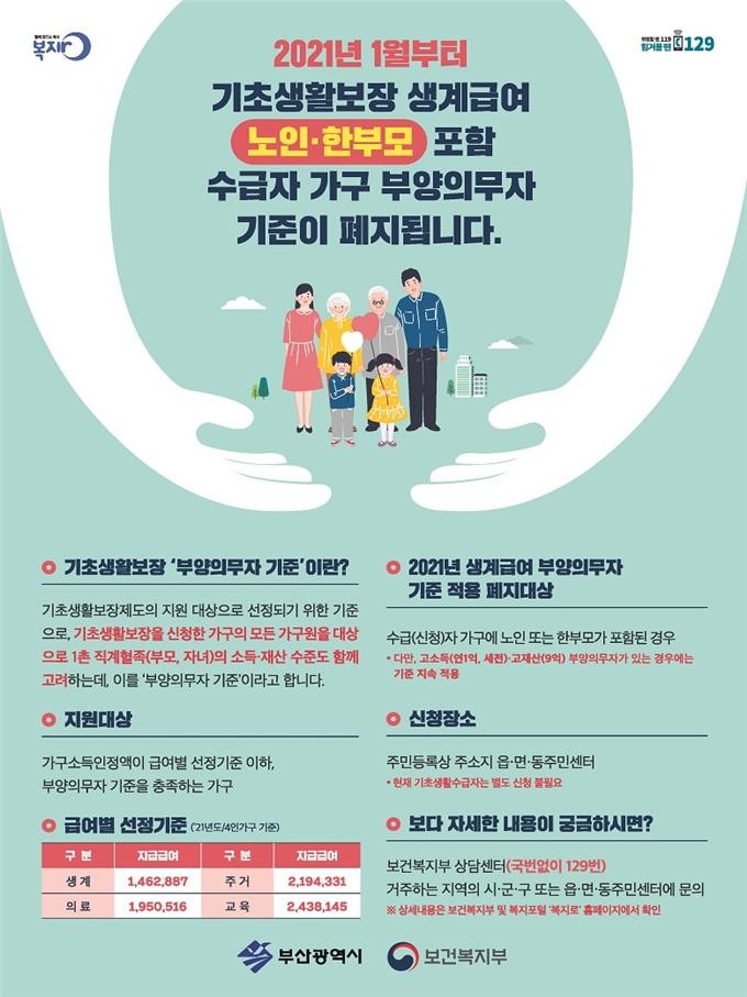 부산시(시장 권한대행 변성완)가 2021년 1월부터 ‘생계급여 수급자 부양의무자 기준’을 폐지한다고 밝혔다.