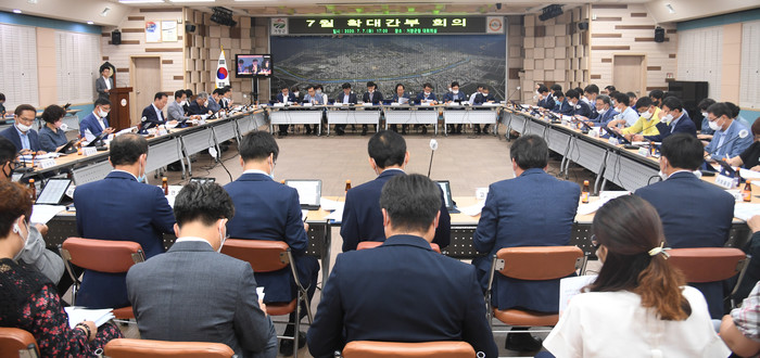 이날 회의는 2020년 하반기 인사이동과 최영호 부군수 발령 이후 처음 개최되는 확대간부회의로, 조직이 새롭게 정비된 만큼 민선 7기 후반기 2년의 새로운 6대 비전 추진을 다짐하는 자리로 마련됐다.