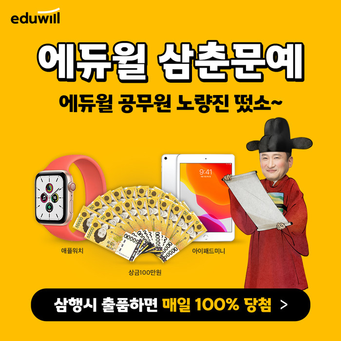 에듀윌 공무원 삼춘문예 이벤트는 대상으로 선정된 1명에게 상금 100만원을 지급하고, 최우수상 1명에게는 애플 아이패드 미니 64GB를, 우수상으로 선정된 3명에게는 애플워치 SE를 증정한다.