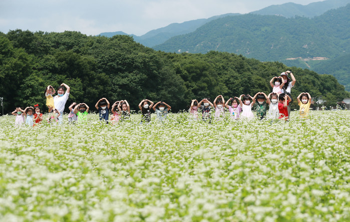 경남 함양군 천년의 숲 상림공원 경관단지에 메밀꽃이 만개해 나들이 나온 연꽃어린이집 원생들이 메밀꽃 사잇길을 걸으며 즐거운 시간을 보내고 있다.
