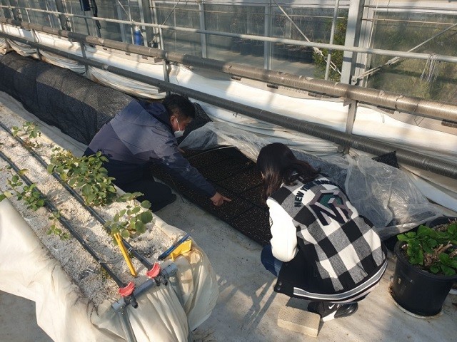 | ▲ 강진군농업기술센터 직원들이 ‘꿀잠프로젝트’ 흑하랑 상추를 점검하고 있다. (사진제공=강진군청) |