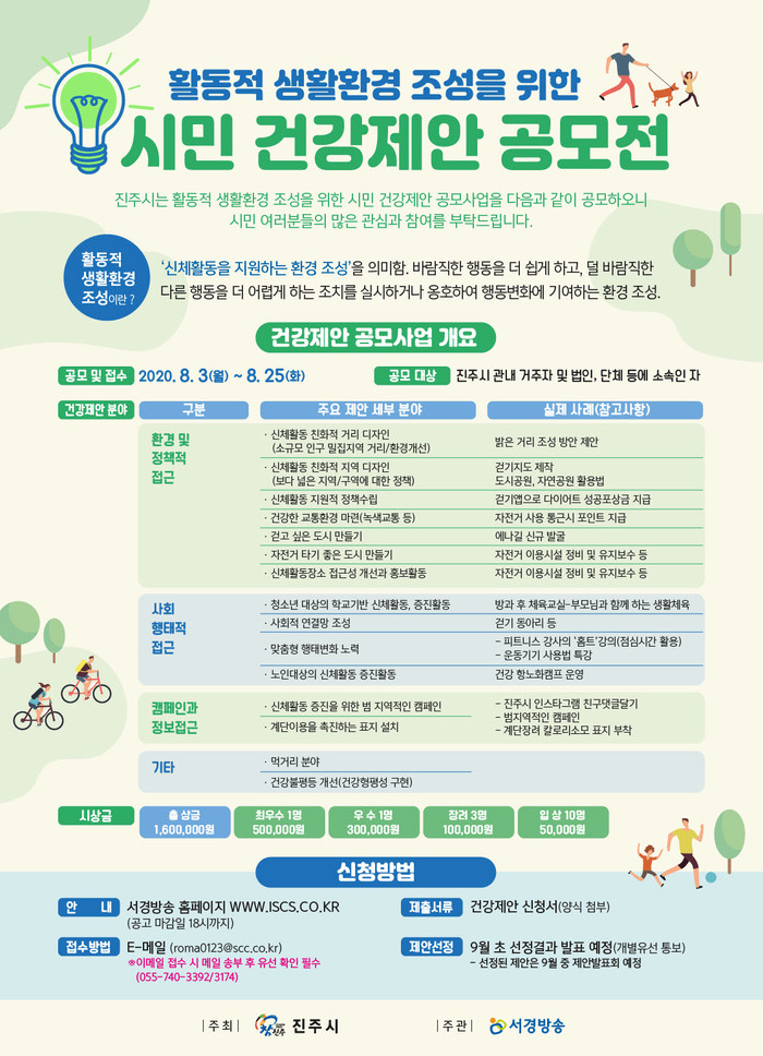 이번 공모전은 신체활동을 지원하는 환경을 조성하여 시민들의 활동적 행동변화의 기회를 만들고자 마련됐다. 진주시 관내 거주자 및 법인, 단체 등 누구나 참여 가능하며, 이달 25일까지 이메일을 통해 접수하면 된다.