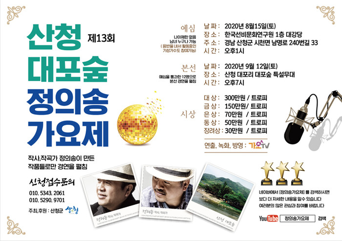 산청군이 새로운 트로트 스타를 발굴하는 ‘제13회 산청 대포숲 정의송 가요제’ 경연무대에 오를 예선 참가자를 모집한다.