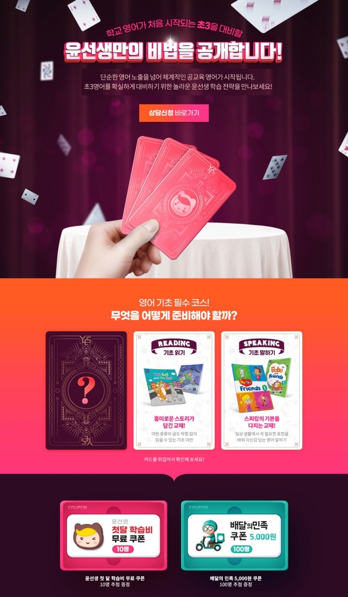 학습 상담이 완료되면 추첨으로 선정된 10명에게는 1개월 영어 학습비를 면제해 준다. 또한, 추첨을 통해 100명에게는 배달의민족 5000원권 쿠폰을 증정한다.