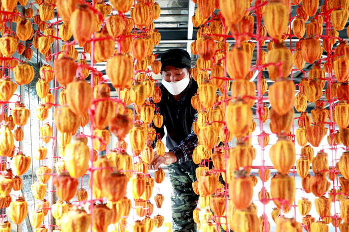 | ▲ 자실농원덕장에서 제증모씨가 출하를 앞둔 대봉곶감을 손질하는 모습 |