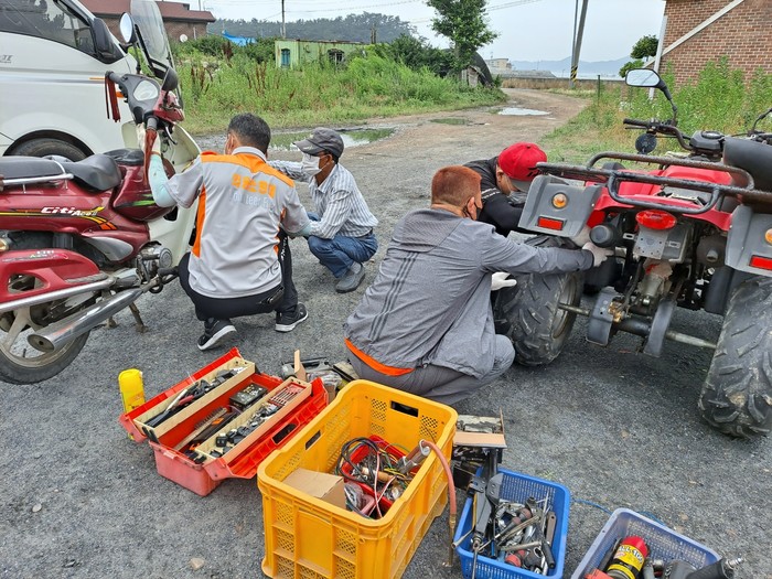 충남 홍성군 갈산면 남·여의용소방대는 최근 보령시 삽시도 섬마을에서 재능기부 봉사활동을 진행했다. 이번 행사에 갈산면 남·여의용소방대원 30여명이 참여한 가운데 섬마을 취약계층 가구를 대상으로 봉사활동을 진행했다. 사진은 의용소방대원들이 농기계를 수리하고 있는 모습.(사진제공=홍성군청)