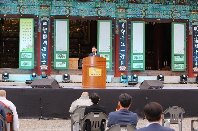 | ▲ 전동평 영암군수가 지난 25일 월출산 소재 도갑사에서 열린 제16회 도선국사 문화예술제에 참석해 인사말을 하고 있다. / 사진=영암군 제공 |