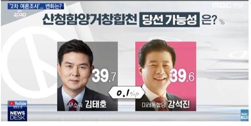 이는 같은 기관이 지난달 31일 조사한 강석진 37.4%, 김태호 31.7% 결과에 비교하면 김태호 후보가 높은 상승세를 보이고 있는 것이다.