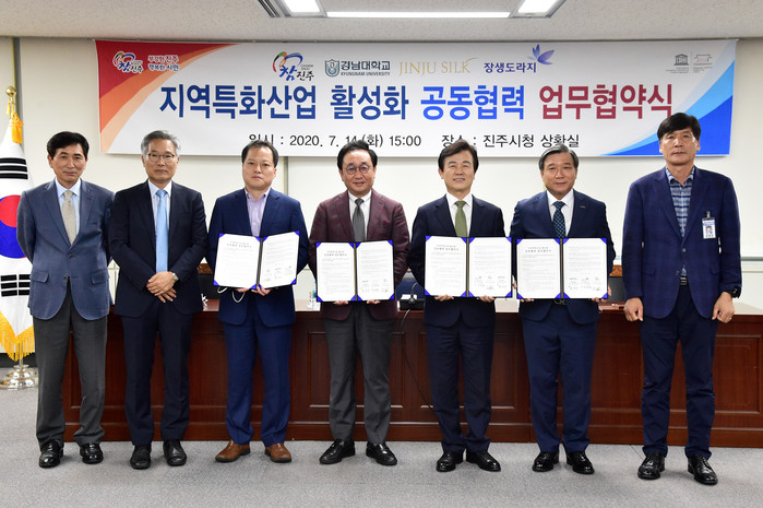 진주시와 경남대학교, 지역특화업체인 ㈜실키안, ㈜장생도라지는 지난 14일 오후 3시 진주시청 상황실에서 지역특화산업 활성화를 위한 공동협력 업무협약식을 가졌다.