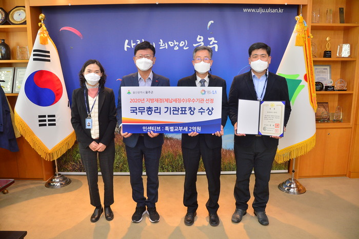 울주군은‘부도법인 끝까지 추적하여 체납세 16억원 전액 징수’를 주제로 지방세 분야 세입증대 우수사례 동영상 발표로 종합심사 결과 7위를 차지해 국무총리상을 수상했으며 재정 인센티브 특별교부세 2억원도 함께 확보했다.