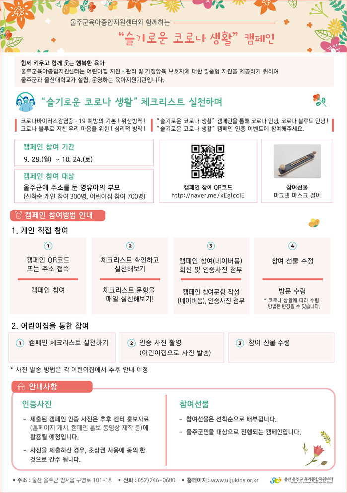 ‘슬코생 캠페인’은 9. 28.(월)부터 10. 24.(토)까지 약 한 달간 진행되며, 울주군에 거주하는 영유아의 부모가 개별적으로 참여하거나 울주군에 소재한 어린이집을 통해 참여 가능하다.