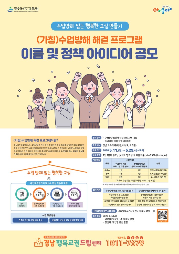 경상남도교육청(교육감 박종훈)은 학교 현장 교원의 가장 큰 바람 중의 하나인 ‘수업방해 없는 행복한 교실’을 만들기 위해 2020년 정책 과제로 추진 중인「수업방해 해결 프로그램」의 현장 정책 아이디어를 공모한다.