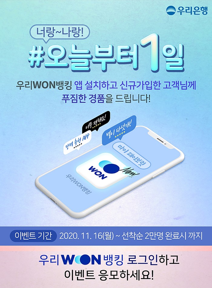 [시민일보 = 홍덕표 기자] 우리은행은 모바일뱅킹 '우리WON뱅킹' 최초 가입고객 2만명을 대상으로 '너랑 나랑~! #오늘부터 1일' 이벤트를 진행한다고 19일 밝혔다