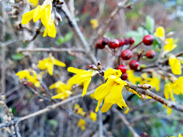 겨울의 시작을 알리는 입동을 나흘 앞둔 4일 영하의 날씨에도 불구하고 의령군 한우산 800m 정상 부근에 개나리가 만개해 찔레꽃 열매(색미자)와 어울려 등산객들의 발길을 멈추게 하고 있다.