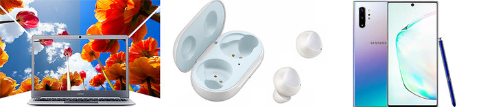 | 사진 왼쪽부터 아이뮤즈 스톰북14 아폴로, 갤럭시 버즈, 갤럭스 노트10 |