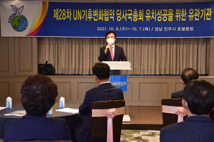 조규일 진주시장은 환영 인사에서 “남해안 남중권에 COP28 유치가 확정되면 영호남 동서 화합과 지역 균형발전 등 상생발전과 더불어 지방자치단체가 협력하여 탄소중립을 실현해 가는 세계적인 성공 모델이 될 것”이라고 말했다.