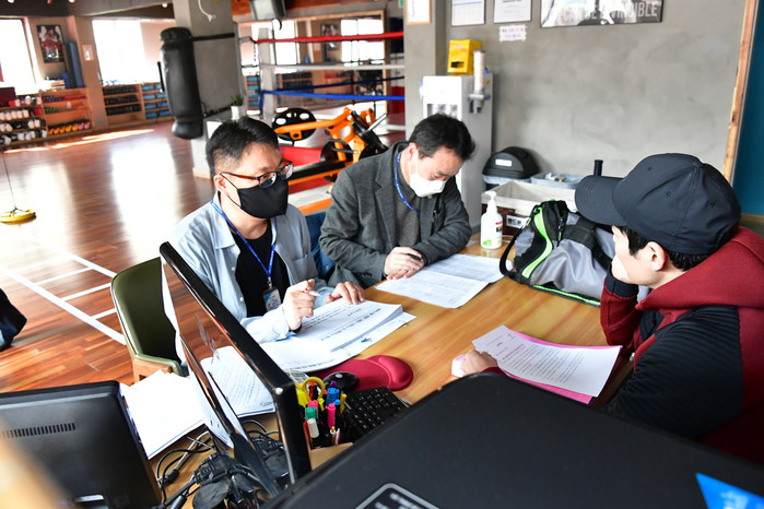 | ▲ 구청 직원들이 지역내 체육시설을 방문해 2주간 영업중지 권고사항을 전달하고 있다.(사진제공=중랑구청) |