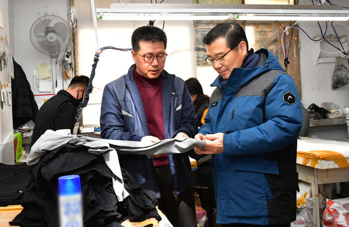 | ▲ 지역내 기업을 찾은 류 구청장이 회사 관계자와 이야기를 나누고 있다.(사진제공=중랑구청) |