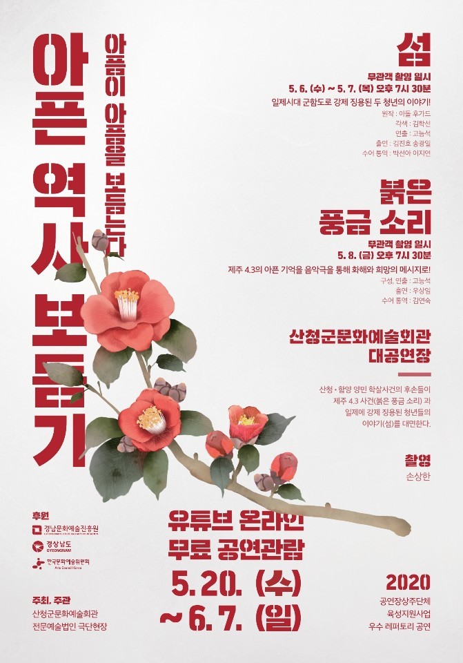 군 관계자는 “우리 산청 지역에는 6.25 당시 무고하게 학살된 산청·함양 지역 군민들을 추모하는 공원이 마련돼 있다. 이번 공연은 그 아픔을 보듬기 위해 일제에 강제 징용된 청년들의 이야기와 제주4.3 이야기를 시리즈로 묶은 것”이라며 “온라인으로 이뤄지는 공연이지만 많은 주민들께서 관람하시길 바란다”고 밝혔다.