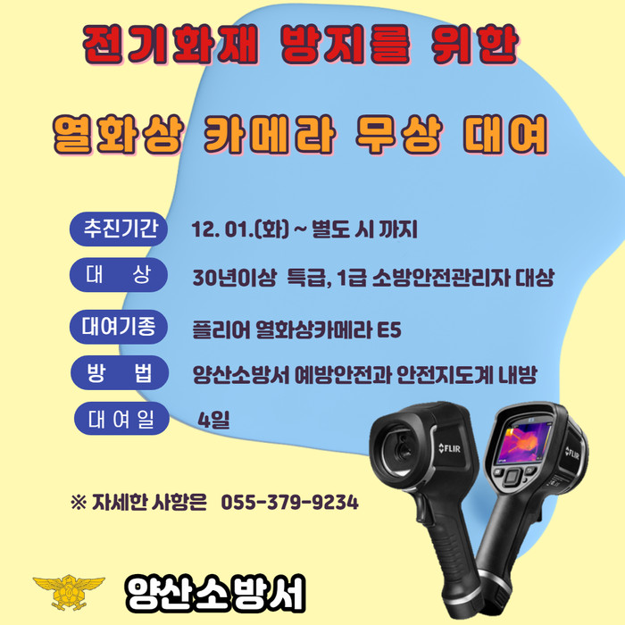 이번에 무상 대여하는 열화상카메라는 양산소방서 소방안전대책협의회(서영옥 회장 외 14개 회원사)에서 기증한 장비다