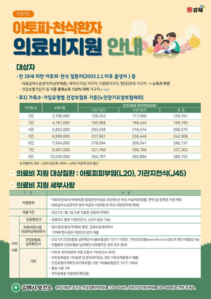 대상은 관내 만 18세 미만(2003년 1월 1일 이후 출생자) 아토피 피부염(L20), 기관지천식(J45) 환자 중 의료급여 수급권자, 세자녀 이상 가구자, 다문화가구자, 편(조)부모 가구자, 기준 중위소득 120% 이하 가구자(4인 가족 기준 건강보험료 – 직장가입자 203,558원/지역가입자 216,474원)이다.