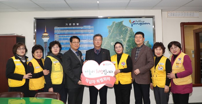 시의회 의장실에서 진행된 전달식에는 양산시의회 의장단과 임군빈 대한 적십자사 경남지사 사무처장, 임원혜 적십자사봉사회 양산지구협의회장 및 임원들이 참석했다.