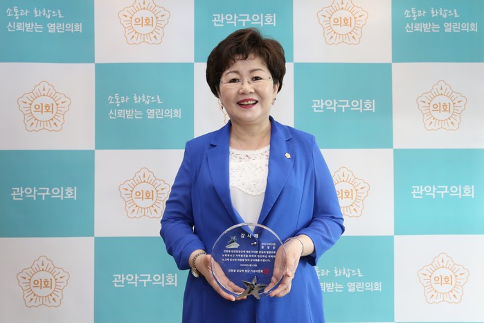 | ▲ 왕정순 의장이 감사패를 들고 기념촬영을 하고 있다.(사진제공=관악구의회) |