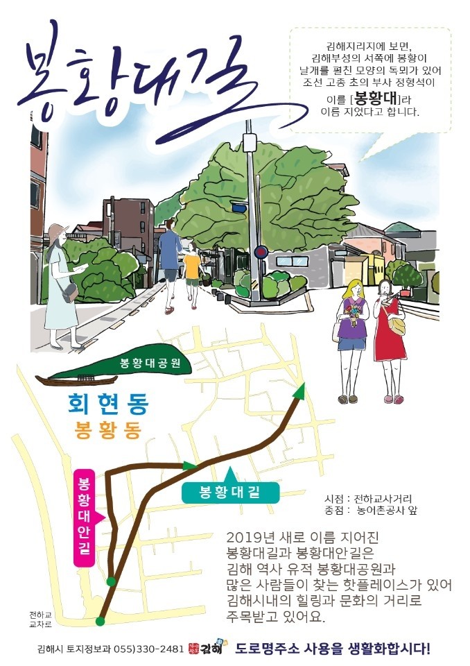 김해시는 봉리단길로 불리우는 한국농어촌공사 김해지사에서 전하교까지 도로명인 김해대로2273번길을 봉황대길로 변경 고시한다고 밝혔다.